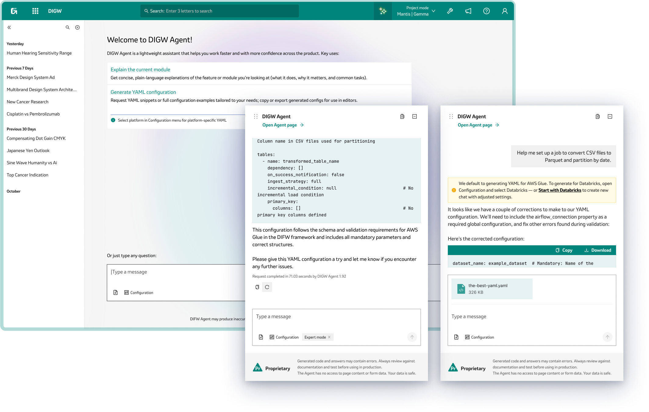 One feature I would like to… feature is the AI agent, that started out as a simple helper for generating YAML configurations—users could just type a prompt, and the agent would create the setup needed for a new pipeline. But as the project grew, so did the agent’s role. It evolved into a full-fledged platform assistant, able to provide context-aware information about whichever module the user was working in.